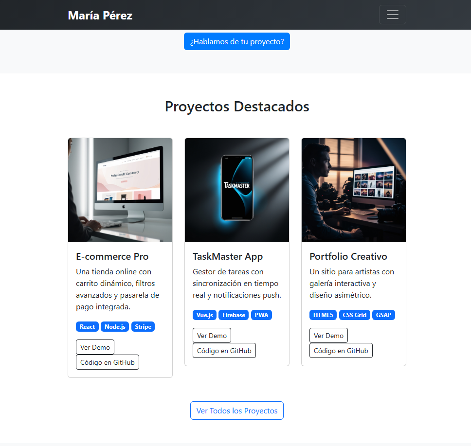 ✅ Portafolio interactivo: Galería de proyectos con efectos hover, badges de tecnologías y enlaces a demos/código.