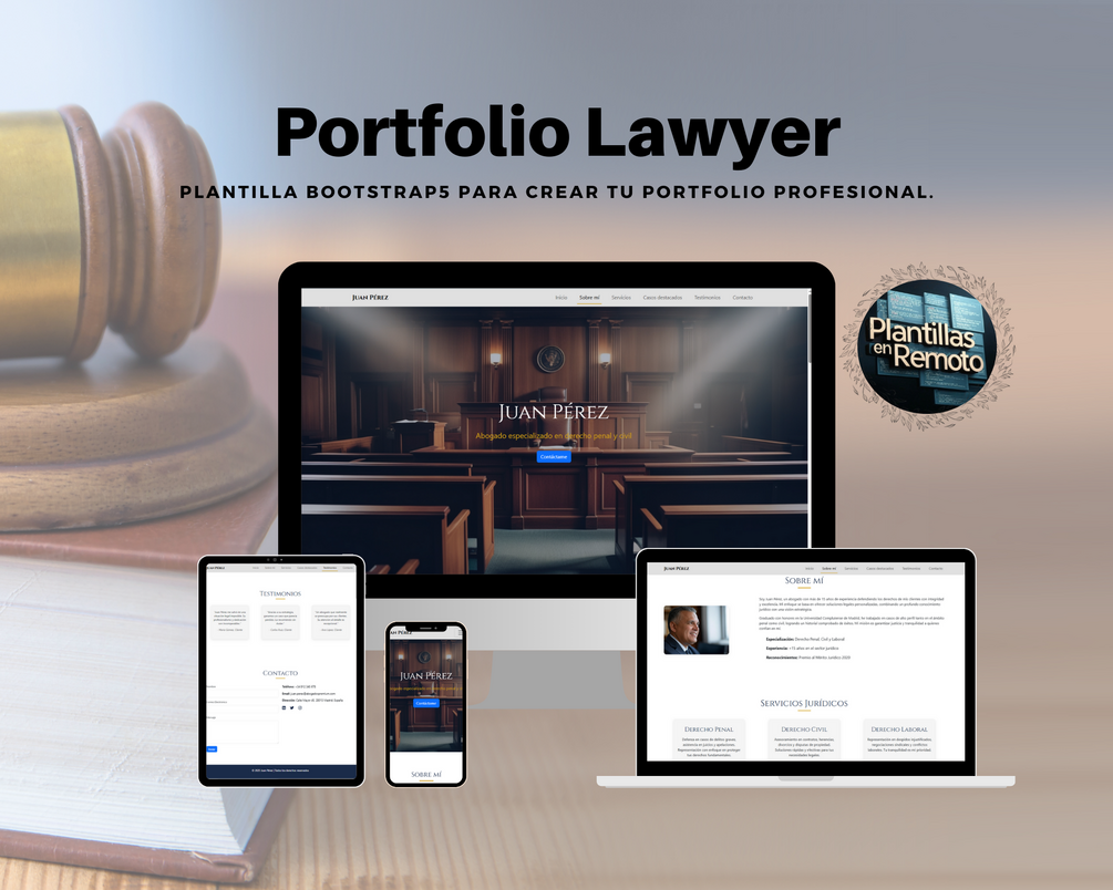 Eleva tu presencia profesional con este portafolio premium diseñado específicamente para abogados y profesionales del derecho. Construido con Bootstrap 5, este template ofrece un diseño moderno, responsivo y elegante que se adapta perfectamente a cualquier dispositivo, desde móviles hasta escritorios.