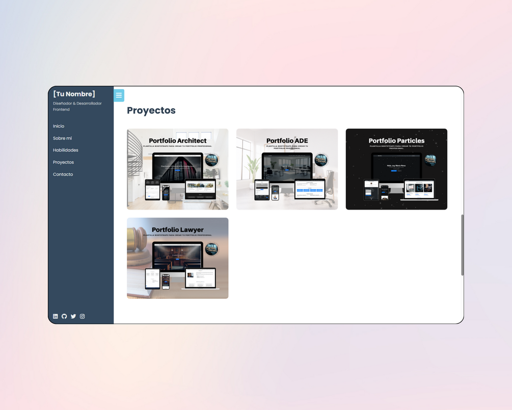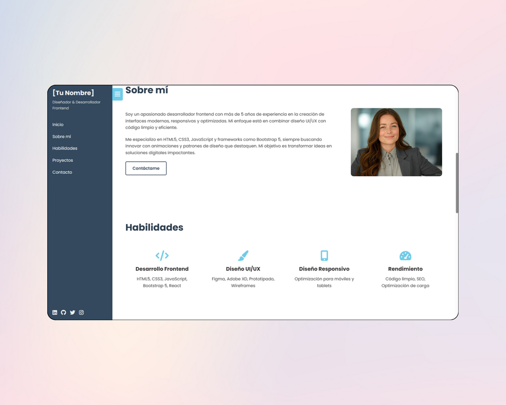 • ✅ Secciones Completas: Incluye Hero, Sobre mí, Habilidades, Proyectos, Contacto y Footer, con contenido de muestra realista para empezar de inmediato.