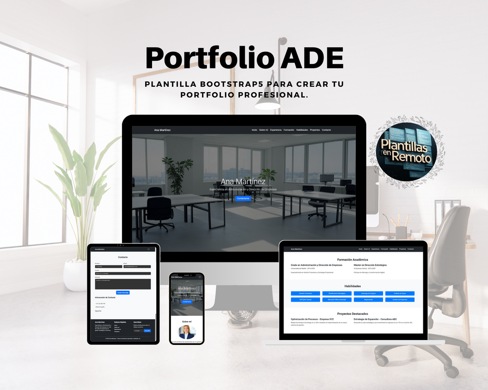 ¿Buscas destacar como profesional en Administración y Dirección de Empresas? Este template es tu solución: un portfolio moderno, sobrio y 100% responsivo, diseñado con Bootstrap 5, HTML5, CSS3 y un toque de JavaScript. Perfecto para mostrar tu experiencia, habilidades y proyectos con clase y profesionalidad.