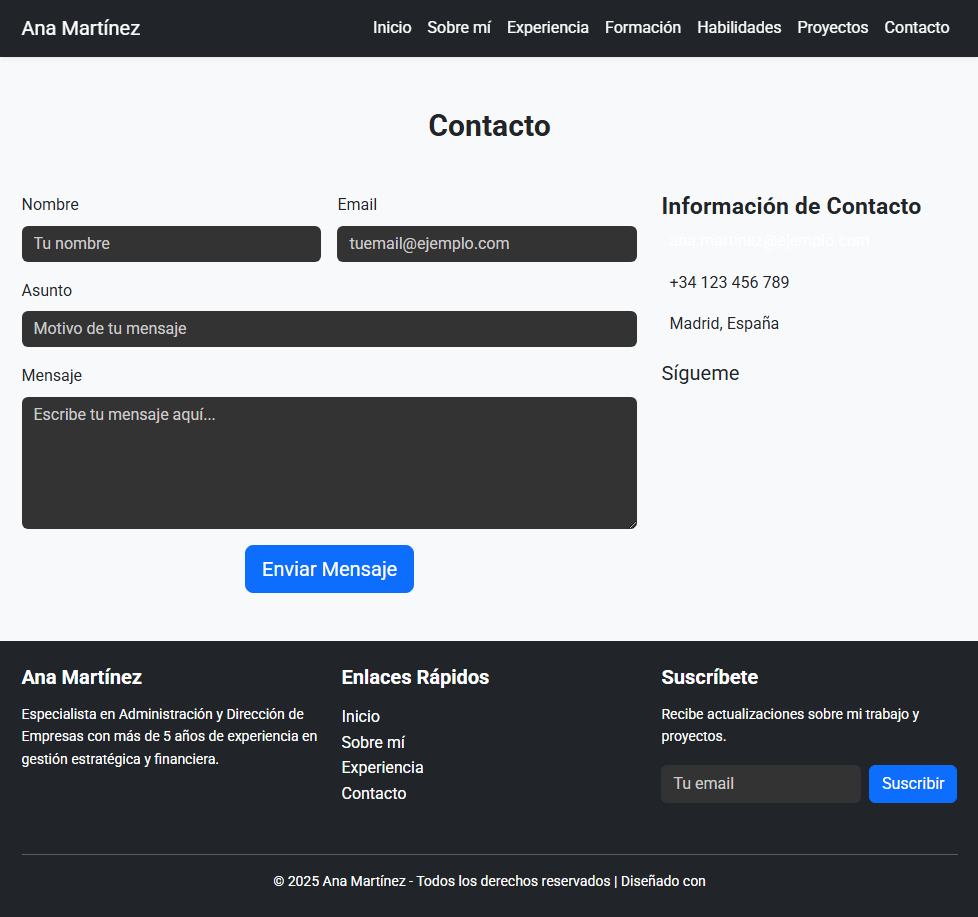 - Secciones completas: Sobre mí, Experiencia, Formación, Habilidades, Proyectos y Contacto.